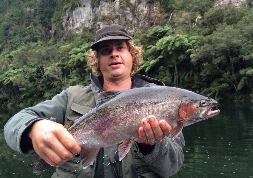 We also got out of the boat and waded up to the plunge pool below the waterfall and fished this with rabbit flies below ball sinkers on spinning rods. Joe really dialled in his technique here, with a couple of very good fish hooked before he managed to keep one on the hook long enough to get it in the net – a good condition 4lb rainbow!