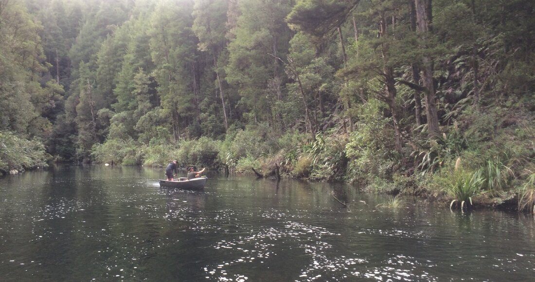 We began by entering the Waipapa River that flows in near the boat ramp. There is a small entrance below a bridge, not much wider than the boat. This then opens out into a large forested lagoon. This time we had two boats – a larger fibreglass boat and a smaller tinny. The two guys in the Tinny (nicknamed the Dukes of Hazzard for their high speed, fish-spooking approaches to new fishing spots), were glad to see a floating platform in the middle of the lagoon and got a break from sitting on their metal bench seats.