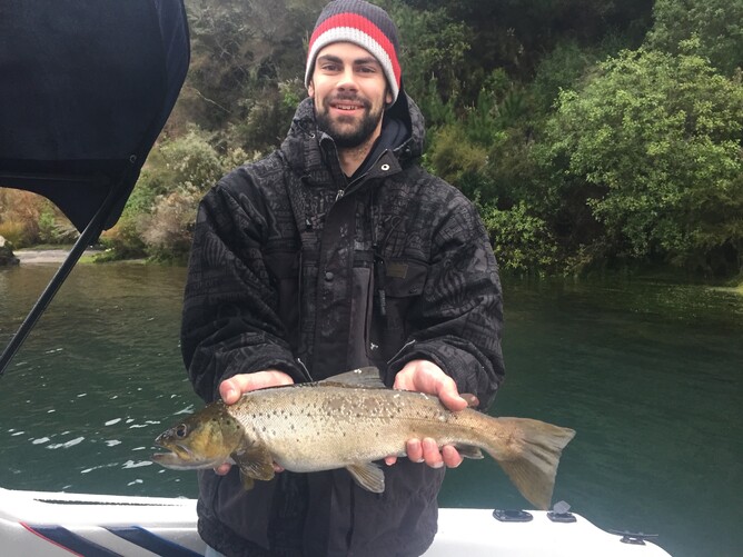 The first fish from this stream mouth is the most memorable fish of all of the Hydro Explorer Tour trips for me. I was using my Airflo 40+ DI7 fly line (it was my only sinking line at the time, you've got to make do with what you've got) and tied on my "Road Killer" fly. This was the same actual fly that caught me a fish at a stream mouth at Arapuni, still going strong. It was missing a bit of it's bulk now and I'm pretty sure one of the foam eyes had fallen off. The key thing is it still had a large black possum tail head and a heap of copper flashabou. As I shot the 40+ line up onto the shallow sand flat of the delta, the large articulated fly splatted down on the surface like a small bird crash landing. Until you start stripping this fly, it literally floats on the surface as it has no weight—this helps with the serpentine swimming action though. Instantly there was a big swirl only 2 metres to the left of where the fly crash landed. I knew what I needed to do: strip, strip, fish on!! After a good fight, a nice 3.5lb brown was in the net.