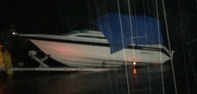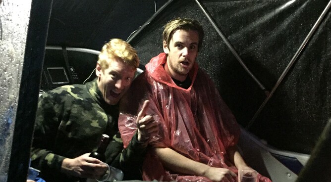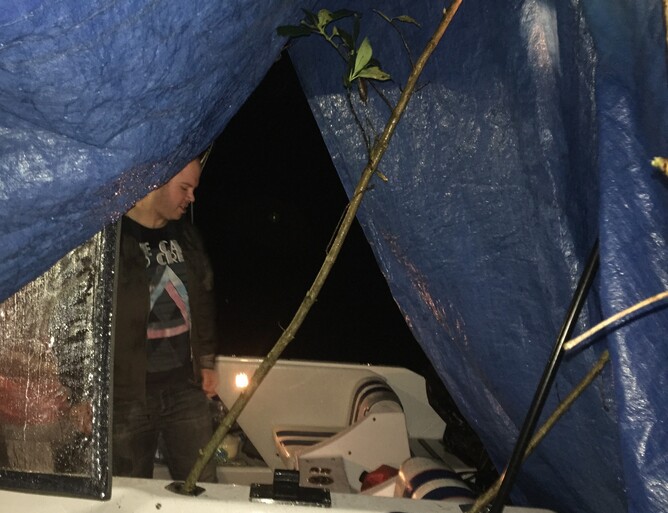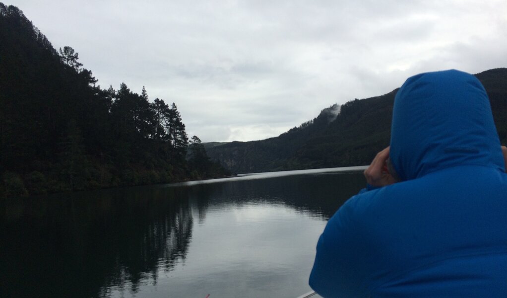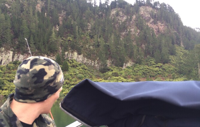 This was our second overnight mission and the next Lake after Maraetai. We arrived at the boat ramp at dusk and it started absolutely pelting down with rain. One of the boats has a really nice rain cover system but Dukes of Hazzard skipper Kingy fashioned a refugee shanty out of sticks and a blue tarp. As we slowly motored out into the darkness, we wondered what our next instalment of the Hydro Explorer Tour would have in store. Needless to say, the spotlight was pointed at the floating shanty for maximum comedy value.