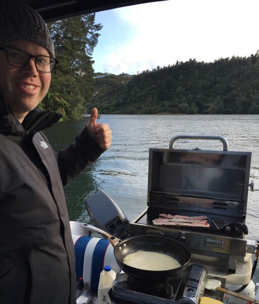 An hour later the sun was creeping through and the rain stopped enough for some pancakes and bacon cooked on the back of the boat.